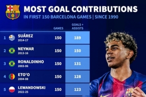 巴萨生涯欧冠前150场参与进球榜:苏牙189球居首 亚马尔100球第十