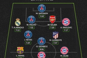 体育资讯4月16日讯 欧冠八强战已经完赛,whoscored也列出了本轮评分最佳阵容,巴黎4将、拜仁3人。