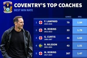 兰帕德执教考文垂以来带队参加79场比赛,场均拿到1.84分,考文垂历任主帅场均拿分最多(至少执教30场)。